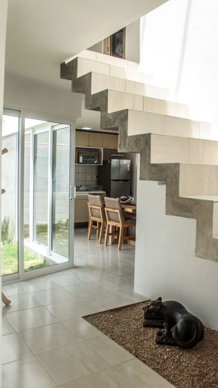 La Casa Jaguar se Cierra a la calle para evitar los vientos fríos del norte, y para aprovechar el recorrido del sol durante el día, al interior surge un jardín hacia el sur, favoreciendo la privacidad y generando vistas a las montañas del sur de la ciudad. LA CASA ES DE DOS NIVELES, cuenta en PLANTA BAJA: Estacionamiento para dos autos, Jardín, 1 Baño completo, Sala, Comedor, Cocina Integral equipada con estufa y campana, Patio de Lavado con preparación para lavadora.